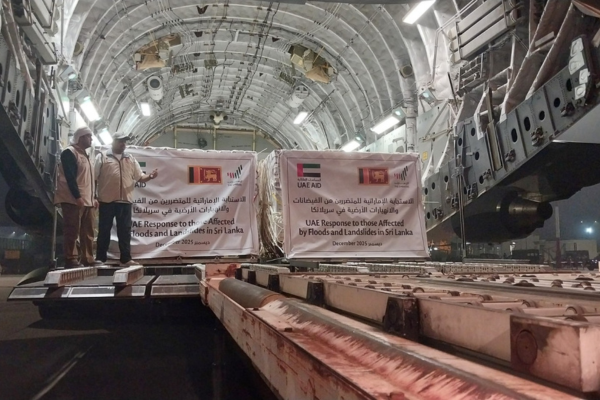 ஐக்கிய அரபு எமிரேட்ஸின் விமானப்படைக்கு சொந்தமான, உலகின் மிகப் பெரிய சரக்கு கொண்டு செல்லும் விமானங்களில் ஒன்றாகக் கருதப்படும் C-17 வகை விமானம், அபுதாபி நகரிலிருந்து இந்த நிவாரண சரக்குகளை ஏற்றி இலங்கைக்கு வந்தது.