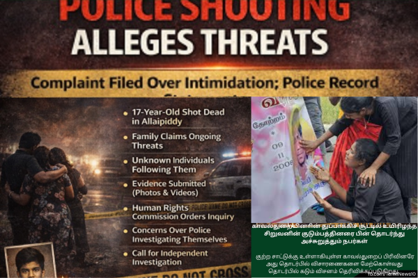 அல்லைப்பிட்டியில் காவல்துறையினாின் துப்பாக்கி சூட்டில் உயிரிழந்த சிறுவனின் குடும்பத்தினருக்கு அச்சுறுத்தல் நிலவுவதாக குடும்பத்தினர் மேற்கொண்ட முறைப்பாடு தொடர்பில் காவல்துறையினா் குடும்பத்தினரிடம் வாக்கு மூலங்களை பதிவு செய்ய நடவடிக்கை எடுத்துள்ளனர். அதேவேளை குற்ற சாட்டுக்கு உள்ளாகியுள்ள காவல்துறைப் பிரிவினரே அது தொடர்பில் விசாரணைகளை மேற்கொள்வது தொடர்பில் கடும் விசனம் தெரிவிக்கப்படுகிறது.